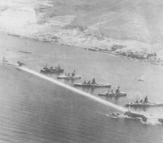 Непосредственно за молом стоят (слева направо): гидроавиатранспорт «Коммандан Тест», линкоры «Бретань», «Страсбург», «Прованс» и «Дюнкерк». Эти фотографии сделаны с самолета-разведчика линейного крейсера «Худ» перед самым началом боя.
