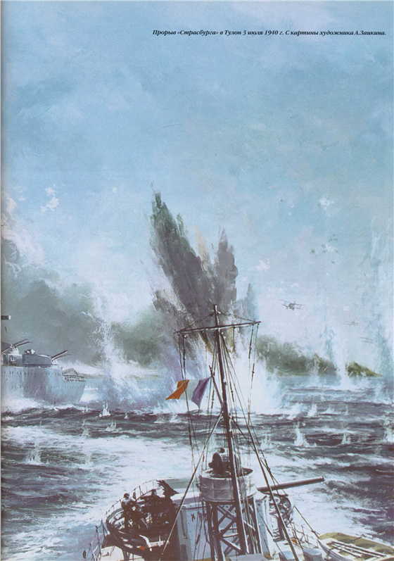 «Страсбургу» повезло больше. Он вырвался из гавани и, избежав попаданий тяжелых снарядов и отразив атаки британских палубных бомбардировщиков, благополучно прибыл в Тулон.