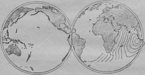 Рис. 40. Вид Земли с рядами вулканов. Расположенные вокруг одной точки Индийского океана жирные линии указывают час за часом распространение прилива, наступившего при извержении Кракатау. Последний отрезок кривой, находящийся у южной оконечности Америки, говорит о том, что волна прилива дошла туда еще с заметной силой через 17 часов после извержения. Окружающая место извержения слабая пунктирная линия означает область, в которой распространялись звуковые явления этого извержения.