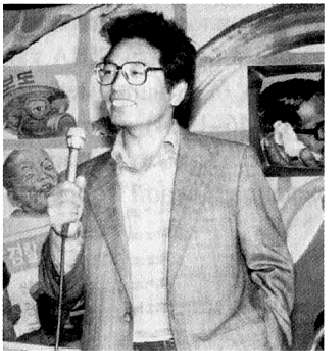 Рис. 46. Поэт-революционер Ким Намджу декламирует свои стихи. В 1980–1987 гг. поэт находился в заключении, причем тюремная администрация первоначально даже отказывалась снабжать его бумагой и письменными принадлежностями. Ряд своих лучших стихов этого периода Ким Намджу написал огрызком карандаша на спичечных коробках, нелегально передававшихся затем на свободу. «Самиздатовские» издания стихов Ким Намджу распространялись по всей стране. Поэт безвременно скончался в 1994 г. от последствий пыток.