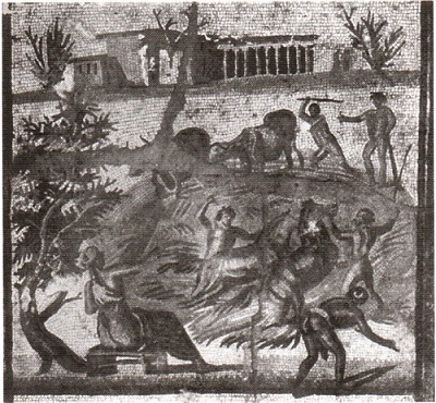 Вилла в Злитене была обильно украшена мозаиками, часть которых может быть поставлена в один ряд с прекраснейшими мозаиками I в. по Р. X. Часть из них — напольные мозаики, часть — настенные украшения. На нашей мозаике изображен ток (????); он находится поодаль от виллы, которая видна на заднем плане. Земля здесь покрыта зерном. За работой следит надсмотрщик, vilicus. Другой человек погоняет палкой пару быков, которые медленно и нехотя движутся по току. С другой стороны двое мужчин удерживают двух вздыбленных, упирающихся коней и гонят их через ток; искусно показан контраст между флегматичными быками и горячими конями. Пятый человек шевелит зерно вилами. Возле тока — красивое старое оливковое дерево, в тени которого сидит женщина, возможно хозяйка дома; она дает указания мужчинам, удерживающим коней.