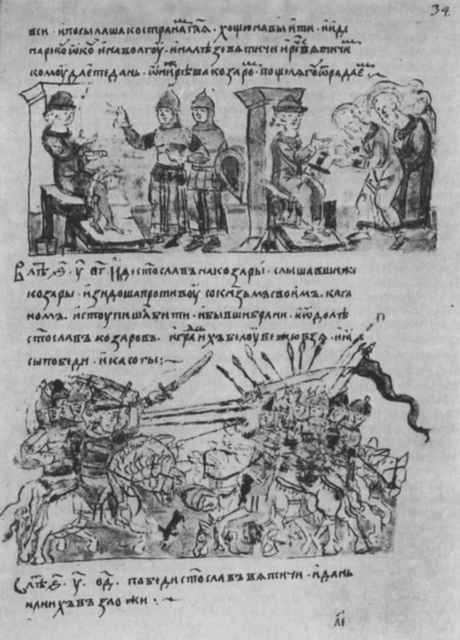 Радзивилловская летопись. Верхняя миниатюра: Святослав принимает побежденных вятичей. 964 г. Нижняя миниатюра: Святослав побеждает хазар. 965 г.