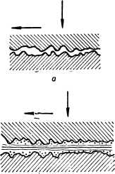 Рис. 61. Схема сухого и жидкостного трения: а — сухое трение; б — жидкостное трение.