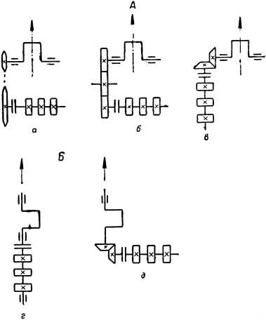 Рис. 89. Схемы устройства моторной передачи, применяемые на мотоциклах в зависимости от расположения двигателя: А — ось коленчатого вала двигателя расположена перпендикулярно плоскости рамы мотоцикла: а — цепная передача; б — шестеренчатая передача с цилиндрическими шестернями; в — шестеренчатая передача с коническими шестернями; Б — ось коленчатого вала двигателя расположена в плоскости рамы мотоцикла: г — непосредственная передача; д — шестеренчатая передача с коническими или червячными шестернями.