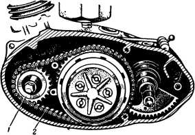 Рис. 90. Моторная передача мотоцикла ИЖ-350: 1 — ведущая зубчатка; 2 — приводная цепь.