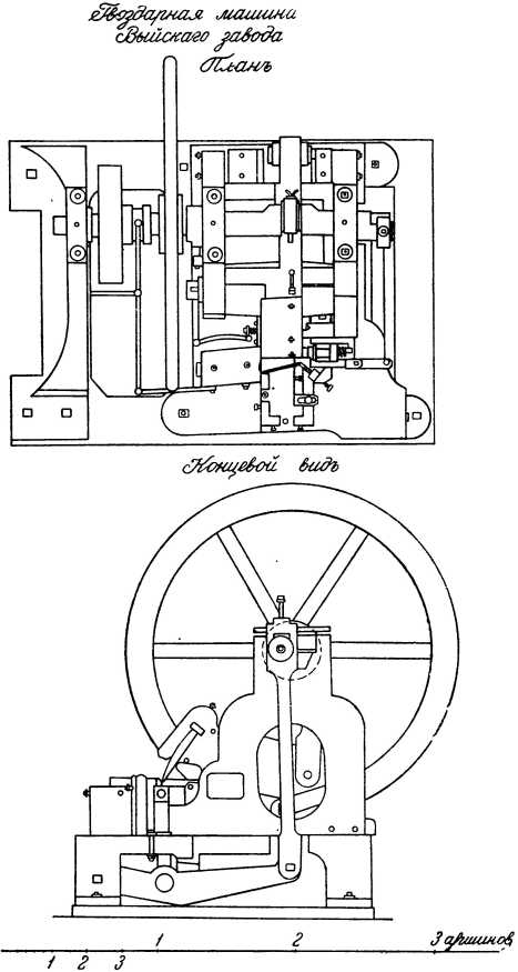 Фиг. 7. Гвоздарный станок Выйского «механического заведения» Черепановых: вверху — план, внизу — «концевой вид».