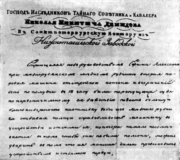 Фиг. 10. Донесение Нижне-Тагильской заводской конторы Демидову о пуске паровой машины, построенной Черепановыми в 1830 г.