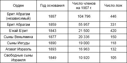 Впоследствии наибольшим влиянием пользовался орден Б'най Б'рит. Он был основан 13 октября 1843 г. в Нью-Йорке несколькими еврейскими иммигрантами из Германии. Сначала он назывался Бундес Брюдер, то есть Союз Братства, немецкое название отражало происхождение основателей. Принятое позже название Б'най Б'рит означает Союз Завета. В более поздней книге, посвященной истории ордена, говорится: