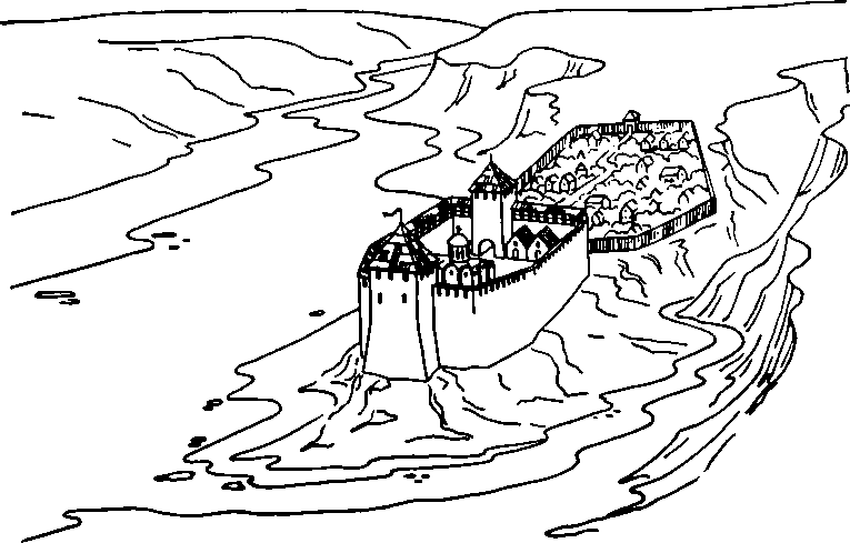 Хотинский замок и посад. Вторая половина XIII — первая половина XIV в. Реконструкция Ю. Г. Логвина