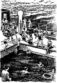 Здесь действительно от солнца деваться некуда. С одной стороны «солнечной» палубы спортивная площадка, огороженная высокой сеткой. На ней пассажиры играют в теннис и волейбол. С другой стороны — большой бассейн и солярий. В бассейне можно плавать, даже играть в водное поло. Рядом с бассейном «раздевалка», холодные и горячие души.