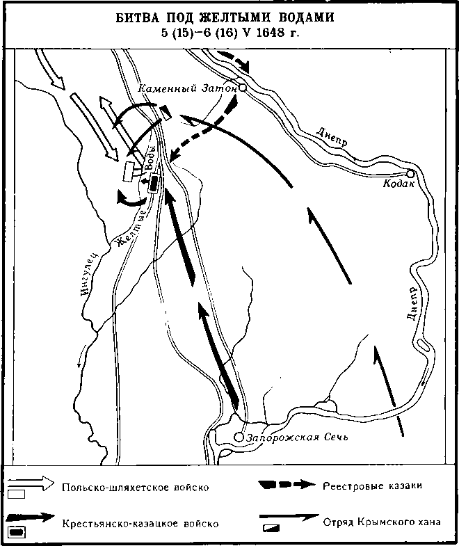 Победы крестьянско-казацких войск под Желтыми Водами и Корсунем. В 1648 г. Б. Хмельницкому предстояло решить ряд важных военно-политических задач. Во-первых, необходимо было поднять на вооруженную борьбу население Левобережной и Правобережной Украины, добиться присоединения к повстанцам реестрового казачества. Не менее важным представлялось объединение всех имеющихся сил в единую армию, умелое руководство их действиями. И наконец, уже в ближайшее время нужно было дать отпор польско-шляхетским войскам, готовившимся к походу на Запорожье.