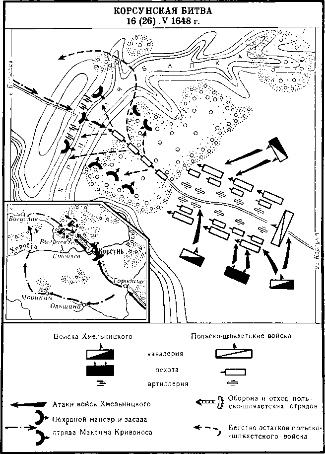 Известие о переходе реестровых казаков на сторону восставших и поражении под Желтыми Водами заставило главные силы польско-шляхетского войска отступить к Корсуню, где оно расположилось укрепленным лагерем. 14 мая войско Б. Хмельницкого подошло к городу. Дезинформированное о численности и намерениях повстанцев командование шляхетских войск приняло решение начать отход на Богуслав и Паволоч. Заранее получив об этом сообщение, гетман на пути их отступления в урочище Гороховая Дубрава решил устроить засаду. 6-тысячный отряд М. Кривоноса соорудил засеки, перекопал узкую дорогу глубоким рвом. 16 мая 1648 г. польско-шляхетское войско вступило в Гороховую Дубраву. Одновременной атакой главных сил Б. Хмельницкого с тыла и отряда М. Кривоноса с флангов оно было разгромлено. Повстанческие отряды взяли в плен 8,5 тыс. человек, в том числе обоих гетманов. Были захвачены также вся артиллерия (41 пушка), обоз, знамена. Победа имела большое значение для дальнейшей активизации народных восстаний на Украине.