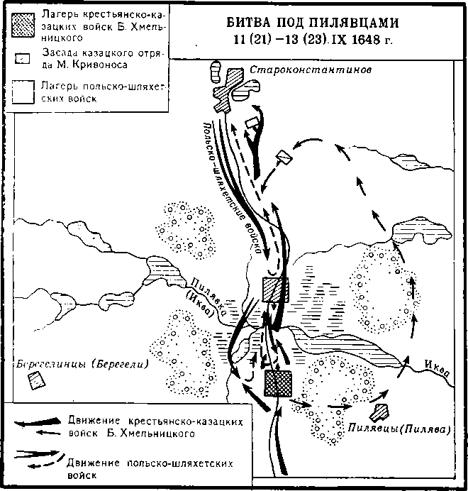 Первое столкновение под Пилявцами произошло 8 сентября 1648 г. Продолжаясь несколько дней, оно не принесло, однако, заметных успехов ни той, ни другой стороне. 11 сентября разыгралось крупное сражение за плотину на р. Иква — переправу, которая вела к главному лагерю крестьянско-казацких войск. Б. Хмельницкий на этот раз избрал оборонительную тактику. Одновременно он вводил в бой казацкие отряды, истреблявшие живую силу противника. Лишь 13 сентября 1648 г., когда стало известно, что главные силы польско-шляхетского войска собраны в одном месте, Б. Хмельницкий дал решающий бой. Он закончился полным разгромом королевской армии, остатки которой панически бежали из-под Пилявцев на запад. Трехсотверстный путь до Львова они преодолели за 48 часов. Кроме собственно военных, битва под Пилявцами имела ряд политических последствий.