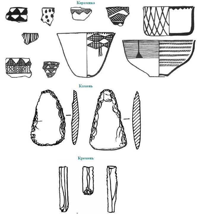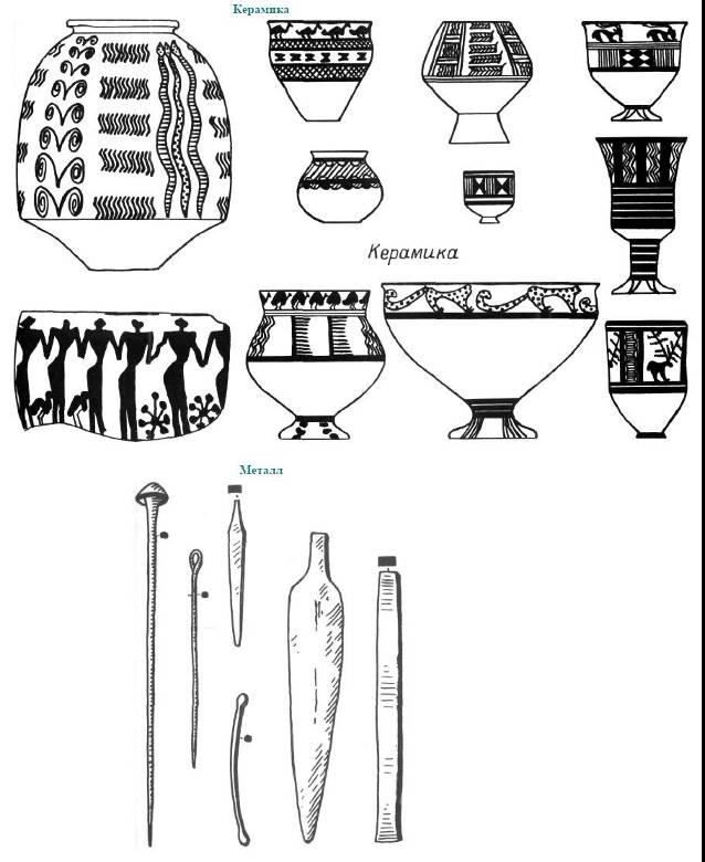 на желтоватый фон красной или коричневой краской и ограничивалась несложными геометрическими элементами — крупными треугольниками и шевронами. На одном из памятников этой культуры — Яник-тепе довольно много изделий из камня, в том числе сосудов и браслетов, что явно указывает на загросские традиции. То же направление культурных связей можно проследить и в кремневой индустрии. Из гипса янтарного цвета изготовлялись бусы и головки фигурок, на Хаджи-Фирузе найдена схематическая глиняная статуэтка женщины с широким коническим основанием, видимо передающим вертикальное положение. Наряду с одиночными захоронениями известны и коллективные, в погребальном обряде заметную роль играла посыпка охрой.