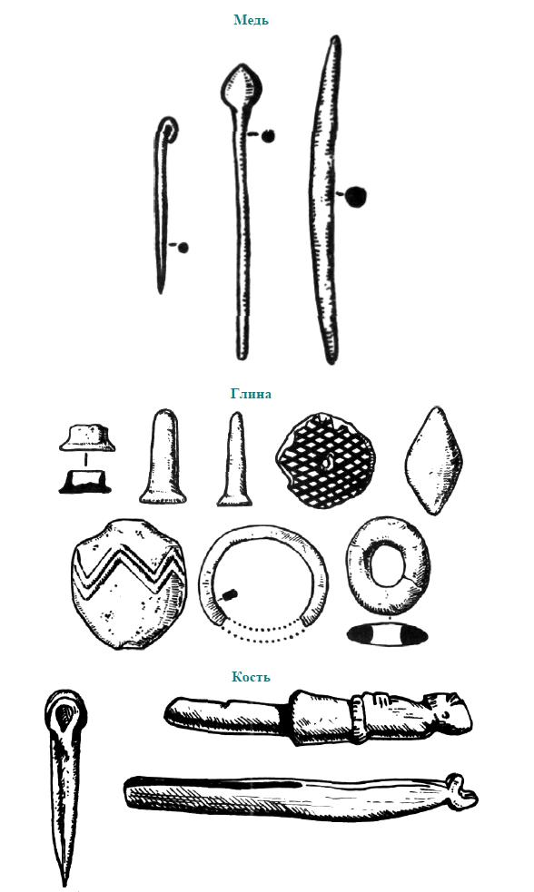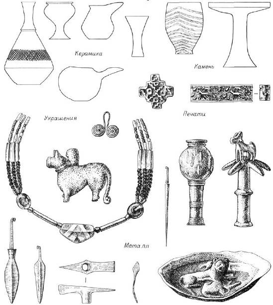 Последняя группа явно продолжает традиции керамики загросской культурной общности в ее южном варианте, известном по Тепе-Гурану. То же можно сказать и относительно браслетов, вытачивавшихся из мрамора и алебастра. Из других украшений можно отметить бусы и подвески, изготовлявшиеся из раковин, добывавшихся в Персидском заливе, и из бирюзы, доставлявшейся из северных районов Ирана.