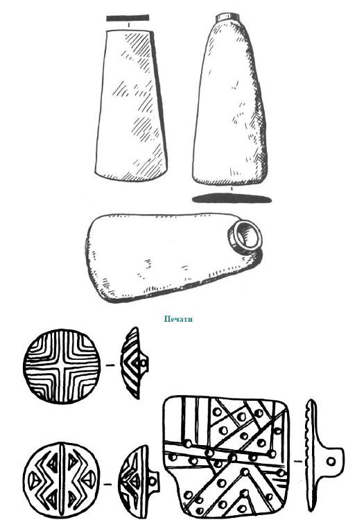 Наконец, третье явление, отмечаемое в пору Сиалка III, также скорее всего было связано с происходившими в это время изменениями в хозяйстве и обществе. Это появление пуговицевидных печатей с несложным геометрическим рисунком. Одна из таких «печаток» была найдена в погребении, что, возможно, свидетельствует об их употреблении в качестве амулетов. Однако находки оттисков на глине ясно указывают, что подобные изделия использовались и как печати. Значение оттиска, первоначально выступающего в функции оберега, со временем расширяет смысловую нагрузку, становясь одним из символов собственности. Об особой престижно-знаковой семантике этих объектов свидетельствует их присутствие в погребениях, которые отличаются также относительно богатым набором других предметов — керамики и медных изделий. Таковы, в частности, могилы из слоя Сиалк III,5. Аналогичное явление можно наблюдать и среди захоронений раннего Гисара.