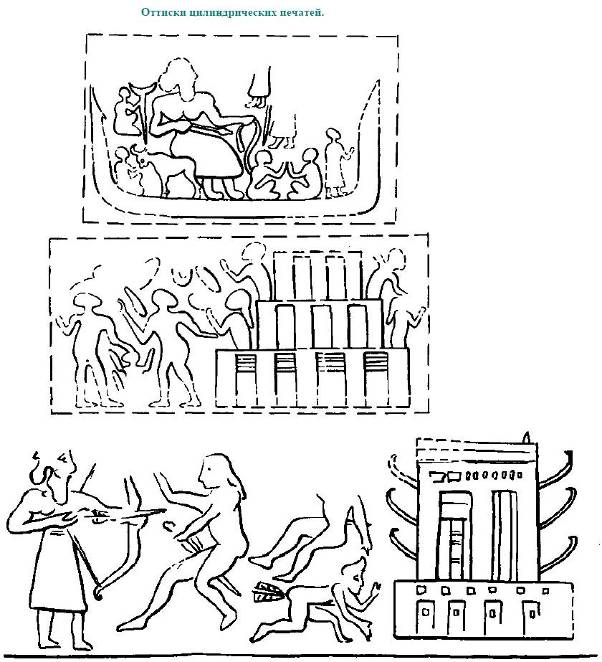 Эти разработки убедительно доказывают, что в середине IV тыс. до н. э. здесь активно идет процесс становления местной цивилизации, использующей ряд стандартов и эталонов, уже выработанных в соседней Месопотамии. В это время почти вся керамика изготовляется с помощью гончарного круга. Одновременно, как это наблюдается в Южном Двуречье, исчезает роспись на сосудах. Наряду с керамикой красного цвета появляется желто-серая посуда, напоминающая по фактуре урукскую керамику Шумера. Близкие параллели наблюдаются и в формах керамики, среди которой широко представлены сосуды с трубчатыми носиками и чаши с петлеообразными ручками. Налицо и дальнейшее развитие металлургии. Топоры с поперечным лезвием несомненно отливались в специальных формах. Довольно сложными изделиями были так называемые булавки с навершием в виде фигур животных и людей. Появляются и металлические сосуды. Таким образом, налицо технический прогресс, формирование ремесел как существенного составного элемента технологического способа производства первых цивилизаций. По оценкам Г. Джонсона, в это время в Хузистане существовало по меньшей мере 52 поселения с общим числом жителей в 25 000 человек (Johnson, 1973, р. 101 —143). Сами Сузы все более приобретают урбанизированный облик. На вершине городища, именуемого Акрополем, раскопана массивная двухступенчатая платформа высотой 3 м и охватывавшая площадь около 60X45 м. Совершенно ясно, что перед нами остатки сложного монументального сооружения, скорее всего, основание храмового комплекса шумерского типа. Не исключено, что это было главное святилище столичного города (Amiet, 1986, р. 55). О развитии высотной архитектуры говорят и изображения на печатях, на которых мы видим строения, имевшие по крайней мере трехэтажную конструкцию. Предполагается четырехступенчатая иерархия поселений, среди которых по крайней мере еще два кроме Суз — Чога-Миш и Чандувех можно считать протогородскими или раннегородскими центрами. Важной инновацией было появление цилиндрических печатей, явно демонстрирующих местный вариант урукской глиптики (рис. 33), как убедительно показал еще Ле Бретон, и к концу периода — булл и табличек с протоэламской иероглификой. Эти материалы явно указывают на распространение функций учета, что подтверждается созданием и совершенствованием системы цифровых знаков. Многоотраслевая экономическая система могла управляться лишь сложным аппаратом, все более отрывающимся уже в силу необходимости специальной профессиональной подготовки от основной массы общинников. Среди сцен на цилиндрических печатях мы находим и воспроизведение персонажей, видимо возглавлявших эту общественную пирамиду, — это образ бородатого жреца-правителя, сидящего на троне в виде быка. Крупномасштабная фигура жреца-правителя явно контрастирует с уменьшенными размерами других персонажей, участвующих в этой сцене, что является типичным иконографическим приемом передачи социальных рангов. Сцены расстрела людей из луков перед монументальной постройкой, имеющиеся на тех же печатях, свидетельствуют, что и в Хузистане становление цивилизации шло отнюдь не бескровным путем одних лишь экономических и культурных преобразований. Как бы то ни было, долгий путь развития древнеземледельческих общин подходит к качественному рубежу. Рождающуюся цивилизаци