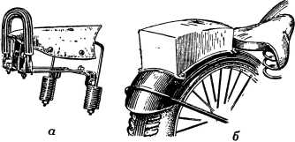 Обычно седло пассажира выполняется легкосъемным и снабжается ручкой, за которую пассажир может держаться. На мотоциклах иногда седло пассажира заменяется специальной подушкой (рис. 157, 6) из губчатой резины специальной формы. Снаружи подушка обивается заменителем кожи, который пришивается к рамке, прикрепляемой болтами к заднему грязевому щитку мотоцикла.