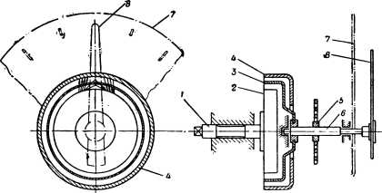 Рис. 159. Схема устройства магнитного скоростного механизма спидометра: 1 — приводной валик; 2— магнит; 3 — картушка; 4 — кожух картушки (магнитный экран); 5 — спиральная пружинка; 6 — ось стрелки; 7 — циферблат; 8 — стрелка указателя скорости.