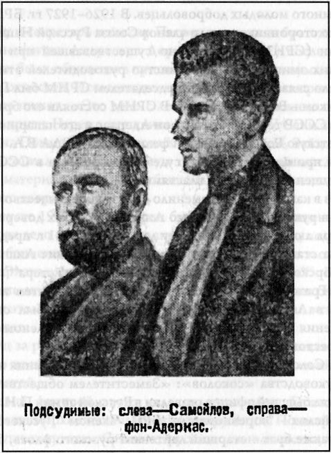 В.А. Самойлов и А.Э. фон Адеркас (Адеркасс) в июле 1927 г. при переходе советско-латвийской границы были арестованы и стали фигурантами известного «Процесса монархистов-террористов». Процесс проходил в виде выездной сессии Верховного суда СССР во главе с В.В. Ульрихом 20–23 сентября 1927 г. Материалы сессии широко освещались в советской печати. «Известия» например, даже печатали выдержки из допросов подсудимых. В.А. Самойлов и А.Э. Адеркас выделены были в отдельное судопроизводство (по степени тяжести) не только потому, что из Латвии их отправил А.П. Ливен, но и по причине категорического отрицания элементов террора в своей деятельности. Простой гдовский мужик Василий Александрович Самойлов и аристократ А.Э. Адеркас признавали лишь факты перехода границы и распространения монархических воззваний644.