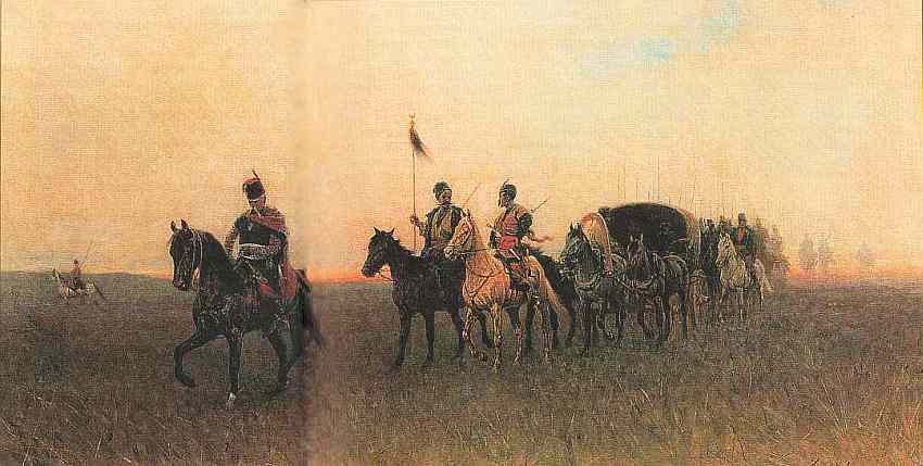 На другой день, перед рассветом, польский обоз поднялся с места; возы с припасами, панские рыдваны со всяким добром, лошади и пушки под охраной пехоты тронулись в путь. Рассказывают, будто паны, по какому-то непростительному легкомыслию, взяли проводником Галагана, хорошо знавшего ту местность.