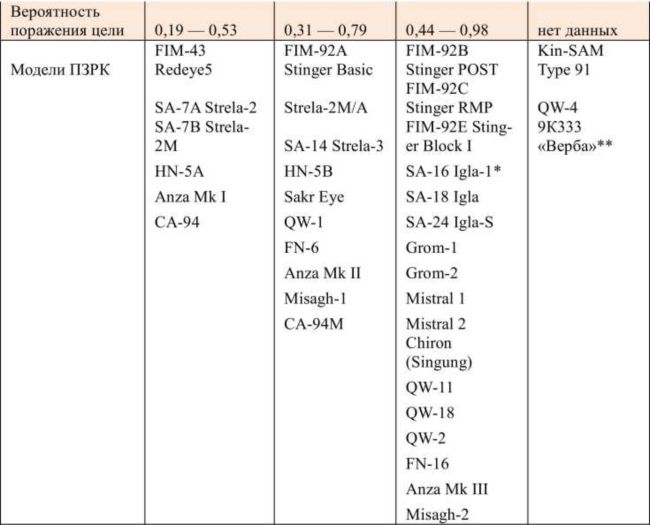 ** данный ПЗРК не был включен в вышеуказанную публикацию, так как поступил на вооружение в 2014 г.; использовано только российское обозначение в связи с отсутствием данных об обозначении НАТО.