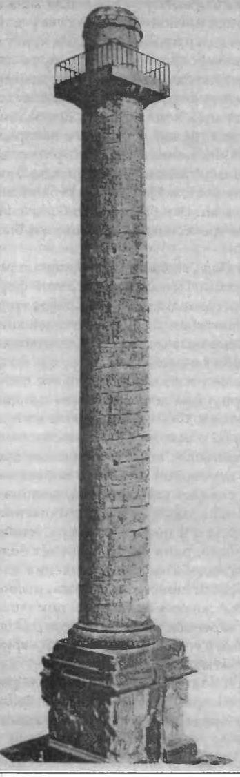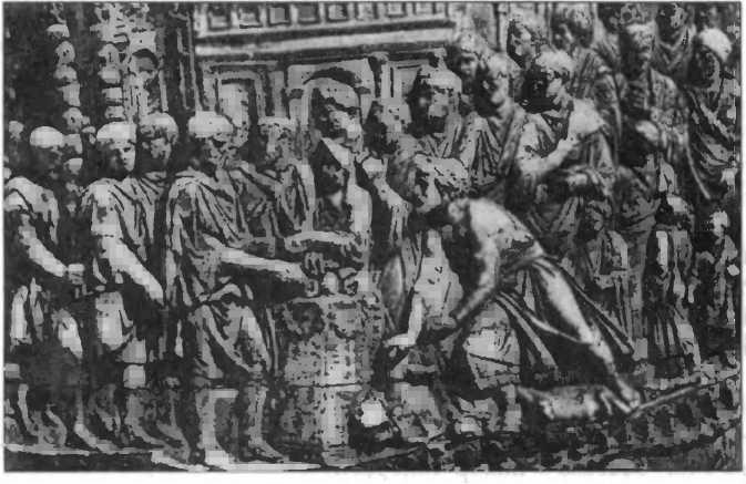 Запечатлеть победы Траяна призван был форум Траяна. Создателем его был грек Аполлодор родом из Дамаска, один из величайших архитекторов и инженеров древности, автор трактата «О военных машинах», дошедшего до нас в рукописи византийской эпохи. Будучи участником дакийского похода (102—105) по возвращении в Рим, он приступил к сооружению форума. Его можно было назвать медным, поскольку, по свидетельству Павсания, кровли находившихся на нем зданий были из меди [52]. Имевший прямоугольную форму (149 х 87), он выделялся среди всех форумов империи сложной композицией. Его окаймляли с трех сторон мраморные портики, между колоннами которых были поставлены изображения великих полководцев и ораторов. С четвертой стороны форума красовалась грандиозная базилика Ульпиана, от которой не осталось никаких следов. Позади нее стояли два здания, обращенные друг к другу фасадами. Это были две библиотеки: одна — для латинских книг, другая — для греческих. Греческий язык был официальным языком империи.