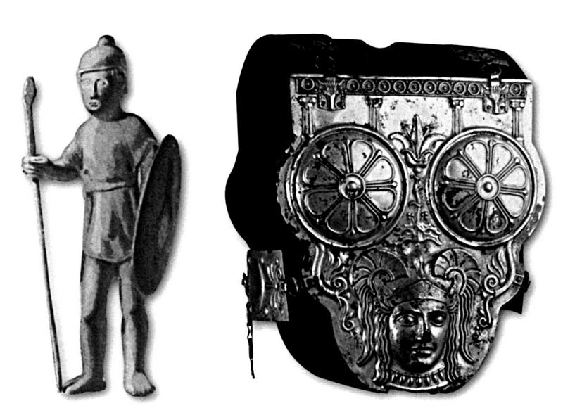 Слева – бронзовая статуэтка римского воина. Вилла Джулия, Рим. Справа – бронзовый самнитский панцирь из гробницы Ксур эс-Сад, Тунис. Музей Бардо, Тунис.
