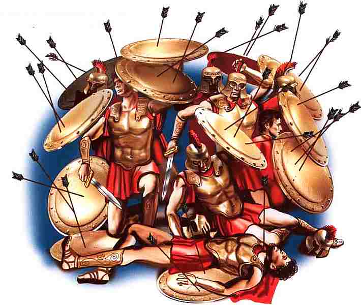 Ксеркс разбил лагерь поблизости от Фермопил и произвел разведку. Когда ему доложили, что проход обороняют лишь несколько тысяч воинов, он громко рассмеялся: «Они, верно, сумасшедшие. На что они рассчитывают?» Царь велел своим послам предложить защитникам прохода сложить оружие и отдать его персам. «Приди и возьми» — ответил Ксерксу Леонид. Желая устрашить спартанца громадностью персидской армии, послы сказали: «Наши стрелы и дротики закроют от вас солнце». — «Ну что же, — ответил на это Леонид, — мы будем сражаться в тени».