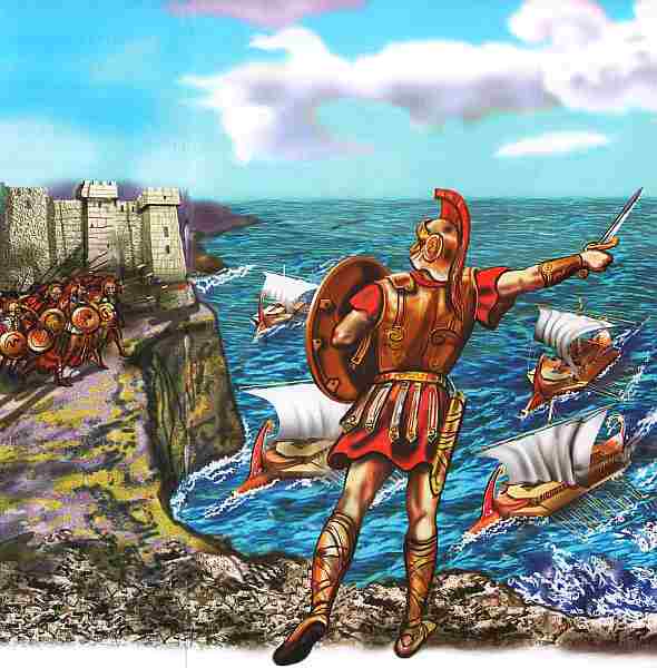 В 480 г. до н. э. полчища Ксеркса переправились через пролив Геллеспонт, отделяющий Малую Азию от Балканского полуострова, и, не встречая сопротивления местных народов, двинулись по побережью в Грецию. Одновременно на море вдоль берега плыл персидский флот. Походным маршем персы миновали Фракию, Македонию, прошли всю Северную Грецию и приблизились к узкому Фермопильскому проходу, которым открывался путь в Среднюю Грецию. Союзная греческая армия еще не успела собраться целиком. Проход охраняли всего 5 тысяч воинов во главе со спартанским царем Леонидом. Но никто из греков не дрогнул при виде надвигающихся на них вражеских полчищ. Они решили биться до конца. По приказу Леонида поперек прохода выстроили стену, за которой заняли оборону.