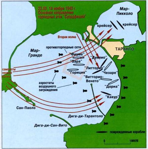 Главной причиной такого грандиозного успеха является использование совершенно нового тактического приема. Атака на Таранто, проведенная исключительно силами английской авианосной авиации 11 ноября 1940 года, — первый в истории боевых действий на море случай применения авианосцев для нанесения ударов по морским базам и базирующимся в них боевым кораблям. Эта операция проложила путь многочисленным повторам в дальнейшем ходе Второй мировой войны.