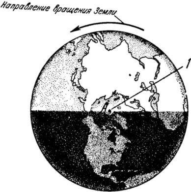 Предположим себе такой фантастический случай, когда наблюдатель находится в межзвездном пространстве против Северного полюса Земли. Отсюда он ясно видит точку воображаемой оси вращения, проходящей через полюс. Земля в течение суток, а точнее, за двадцать три часа пятьдесят шесть минут и четыре с одной десятой секунды, совершает один оборот, вращаясь против часовой стрелки.