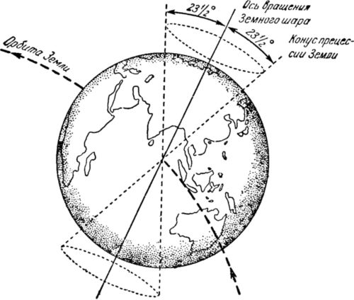 Рис. 17. Изменение наклона земной оси в пространстве под влиянием прецессии.
