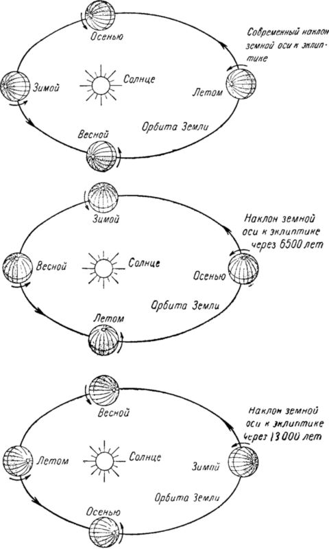 Изменение положения земной оси, как известно, является одной из причин, по которым меняется климат. В наши дни в северном полушарии происходит постепенное потепление летнего периода и похолодание зимнего, а в южном — наоборот. Через тринадцать тысяч лет летом в нашем полушарии станет значительно теплее, чем сейчас. Затем начнется постепенное похолодание. Изменение наклона земной оси к так называемой плоскости эклиптики, то есть к плоскости, в которой движется Земля вокруг Солнца, за ряд тысячелетий представлено на рис. 17.