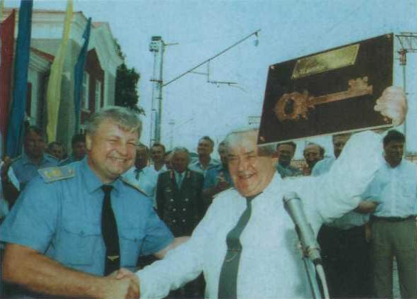 Символический ключ от электрифицированного участка Лубны — Ромодан вручает начальнику ЮЖД В. Несвиту генеральный директор Укрзализныци А. Слободян.