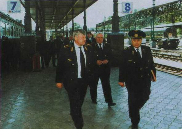 Генеральный директор Укрзализныци А. Слободян на Южном вокзале в Харькове. Его сопровождают начальник станции Харьков-Пассажирский А. Ткаченко и начальник ЮЖД В. Несвит.