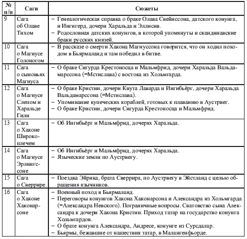 Сведения исландских королевских саг о Восточной Прибалтике, Руси и Русском Севере незначительны на фоне содержащейся в этих же источниках информации по истории Скандинавских стран, и особенно Исландии и Норвегии. Но все же приведенный выше материал свидетельствует об интенсивности и многообразии контактов Древней Руси со Скандинавскими странами. Ниже я предлагаю также краткий обзор восточноевропейских сюжетов в королевских сагах (см. табл. 4).