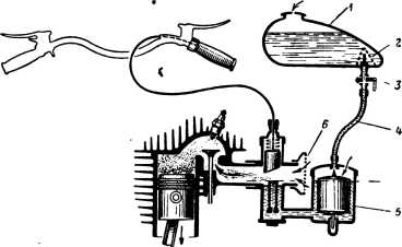 Рис. 64. Схема системы питания мотоциклетного двигателя: 1 — топливный бак; 2 — фильтр; 3 — бензокраник; 4 — бензопровод; 5 — карбюратор; 6 — воздушный фильтр.