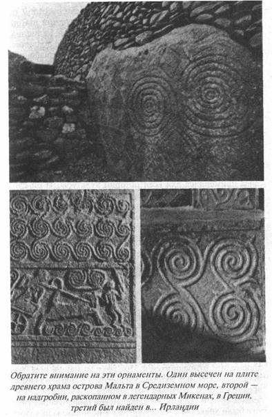 Известно, что гробницы каменного века рассеяны по; Атлантическому побережью Европы от Испании и Португалии до Британии, Оркнейских островов и Скандинавии. Вот и казалось несомненным, что вначале появились микенские спирали, потом — мальтийские. Считалось, что испанские гробницы — работа колонистов из восточного Средиземноморья, прибывших в Испанию вскоре после 2600 года до нашей эры.