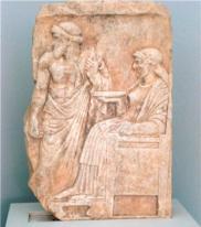Одна из находок крупного размера – мраморный рельеф со стоящим мужчиной и сидящей женщиной, которые смотрят в одну сторону. Предположительно это половина диптиха, от которого не сохранилась левая часть – та, на которую направлен взгляд фигур с правой половины. Рельеф датируется 400 г. до н. э.
