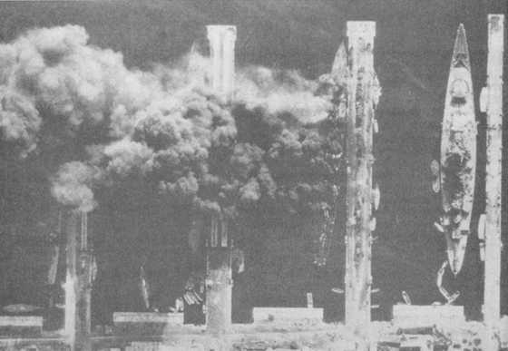 Тулон 27 ноября 1942 г. Справа — линкор «Страсбург», у соседнего пирса — охваченный пожаром крейсер «Кольбер»