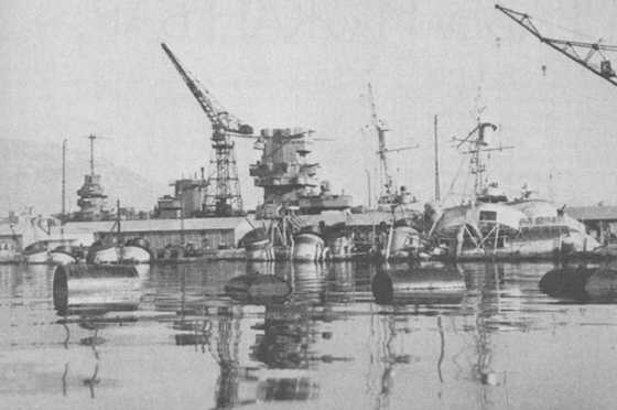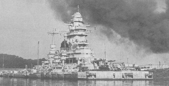 Гавань Тулона. На переднем плане — затопленные эсминцы, за ними — линкор «Дюнкерк»