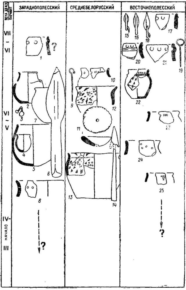 Историю изучения милоградской культуры (далее - МЛГРК) можно разделить на несколько этапов. Первый, охватывающий конец XIX - начало 50-х годов XX в., характеризуется первичным накоплением материала, обследованием памятников раннего железного века южной Белоруссии и северной Украины. Начальное знакомство с новыми категориями древностей позволило А. Н. Лявданскому сделать вывод о различиях материальной культуры раннего железного века северной и южной Белоруссии [218]. Второй этап связан с работами на Полесье Славянской экспедиции ИА АН СССР (П. Н. Третьяков, Ю. В. Кухаренко, О. Н. Мельниковская). В 50-х - начале 60-х годов было раскопано несколько десятков памятников, ставших впоследствии эталонными для изучения МЛГРК. Весь исследованный материал был обобщен в монографии О. Н. Мельниковской, до сих пор остающейся единственным полным его собранием [256]. В то же время изученность подгорцевских памятников северной Украины была значительно ниже, их исследование еще только начиналось [29, с. 53 - 55; 81, с. 197 - 208; 82, с. 5 - 20]. После выхода в свет монографии О. Н. Мельниковской начинается третий этап исследований. Продолжается накопление материала, складывается группа белорусских исследователей во главе с Л. Д. Поболем и A. Г. Митрофановым. Появляются новые обобщающие работы [266; 300; 301; 306; 310; 311; 338]. Несколько выравнивается степень изученности южнобелорусских и северноукраинских памятников. В дополнение к двум вариантам МЛГРК, южнобелорусскому и подгорцевскому, исследования И. К- Свешникова и А. А. Егорейченко позволили выделить волынский и средне-белорусский варианты [113, с. 54 - 61; 338, с. 68 - 81]. Составленные нами карта и каталог памятников МЛГРК (рис. 1; приложение)15 могут послужить основой для более углубленного изучения культуры, более полного понимания процессов культурного развития на территории Волыни и Полесья в эпоху раннего железа. К 1984 г. (материалами, опубликованными в этом году, в основном завершено составление каталога и карты) общая вскрытая площадь на памятниках, содержащих материалы МЛГРК, составила, по неполным данным, около 45 тыс. м, т. е., по сравнению с 60-ми годами, увеличилась почти вчетверо [256, с. 16]. Степень исследованности МЛГРК сравнительно велика: раскапывалось около 20% всех известных памятников, в том числе около 30% мысовых и 10% болотных городищ, более 20% селищ и практически все известные могильники. К сожалению, опубликована лишь небольшая часть раскопанного, а полнота публикаций зачастую оставляет желать лучшего, особенно в отношении керамики. Исследованы в основном южнобелорусские памятники МЛГРК. Перенос полученных при этом выводов на всю культуру отнюдь не способствует лучшему пониманию развития материальной культуры населения бассейна Верхнего Днепра в I тыс. до н. э. От такого одностороннего подхода к изучению милоградско-подгорцевских древностей предостерегала в свое время О. Н. Мельниковская [256, с. 168 - 169]. Поэтому, прежде чем обратиться к изучению хронологии и культурных взаимодействий, кратко охарактеризуем локальные варианты МЛГРК (рис. 1 "а вкладке, табл.). Основным критерием для их выделения послужила территориальная отграниченность групп памятников. Варианты различаются также по типам жилищ, погребального обряда, орнаментации керамики и другим признакам (табл. 1). Выделены следующие варианты: I. Западнополесский; II Среднебелор