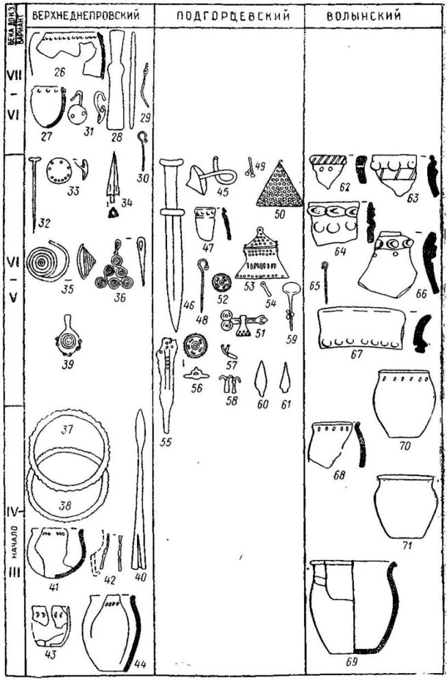 Во вторую хронологическую группу включены типы вещей, датирующиеся в основном в пределах VI - V вв. до н. э. Этим временем датируются сережки с конусовидным щитком (табл. 2, 45), близкие II варианту 5-го типа [297, с. 27]. На городище Мохов II обнаружена форма для их отливки [256, с. 13]. В VI в. до н. э. появляются гвоздевидные булавки различных вариантов (табл. 2, 32) и посоховидные булавки, близкие II варианту 19-го типа (табл. 2, 48, 65), бытующие вплоть до начала III в. до н. э. [297, с. 13, 16- 17]. Большое распространение получает оружие. Дротики (табл. 2, 14) находят аналоги в скифских древностях VI - V вв. до н. э. [208, рис. 2, продолж., 156]. Акинак из Казаровичей (табл. 2, 46) относится к типу V отдела 1, по А. И. Мелюковой, распространенному в Трансильвании в VI - V вв. до н. э. [240, табл. 18, 4, с. 53; 241, рис. 33, 81. Судя по описанию, близок ему акинак из Асаревичей [256, с. 72]. VI - началом V вв. до н. э. датирует Ю. В. Кухаренко копья из Дубойского могильника (табл. 2, 6; 190, с. 11). Скифские ? стрелы, обнаруженные на милоградских памятниках, относятся к типам, распространенным в V-III вв. до н. э. [256, рис.29, 1 - 5]. О. Н. Мельниковская полагает, что скифскими стрелами пользовалось милоградское население [256, с. 69]. С этим трудно согласиться по следующим причинам. Во-первых, полностью отсутствуют следы их местного производства. Во-вторых, нет непрерывности их использования: между ранними стрелами с шипами и стрелами V - III вв. до н. э. лежит лакуна длительностью около столетия. В-третьих, на городище Асаревичи (прил. № 327) большое количество стрел обнаружено на территории разрушенных валов, что, по мнению самой О. Н. Мельниковской, "свидетельствует о борьбе населения городища с нашествиями лесостепных племен" [256, с. 14]. Укладывается в рамки VI - V вв. до н. э. и хронология вещей, обнаруженных на подгорцевских памятниках. VI - V вв. до н. э. датируются конусовидная сережка и акинак из Асаревичей (см. выше). Бляхи с прорезями и отверстиями (рис.3,53) находят аналоги в культуре западнобалтийских курганов конца VI периода бронзы - начала периода раннего железа, что соответствует VI - V вв. до н. э. [447, рис. 125, с. 279; 448, с. 165 - 166]. Литые круглые бляхи с восьмерковидными украшениями (рис. 3, 52, 56) находят аналоги в кобанской культуре и на памятниках Кабарды VI - IV вв. до н. э. [50, рис. 52, 10; 171" табл. XXXIII, 7, с. 55]. Булавки с ажурным навершием (рис. 3, 55) широко распространены в культурах "балтского круга" лесной зоны в IV-III вв. до н. э. [18, рис. 20, 9, с. 129; 274". рис. 2, 3, 6, 7; 275, рис. 28, 9] и находят прототипы в древностях Кабарды, Балкарми и Северной Осетии второй четверти I тыс. до н.э. [101,№76 - 81]. Булавки с навершием в виде двух выпуклых бляшек (рис. 3,51) схожи с верхневолжскими [274, рис.2" 9]. Украшения в виде спаянных по две проволочек с утолщенными концами или шариками на концах (рис. 3, 49, 57), литейная формочка для изготовления которых обнаружена на городище Горошково (прил. № 204), известны в высоцкой культуре [256, с. 85]. Подвески в виде колокольчиков (рис. 3, 54, 58) появляются у скифов в переднеазиатский период их истории [312, табл. X. 1, с. 108]. Аналоги в кобанской культуре находят литые треугольные подвески со спиралевидными узорами (рис. 3;. 36), относящиеся к середине VII-V вв. до э. [171, рис. 1, I,Е]. Ожерелье из погребения в Подгорцах (прил. № 385а) очень близко ожерелью из кургана 3 в урочище Стайкин Верх близ Аксютинцев, датирующемуся V в. до н. э. [150, табл. VIII, 3,. с. 141 -142]. Бронзовые трубочки, на которые прикреплены подвески из Подгор