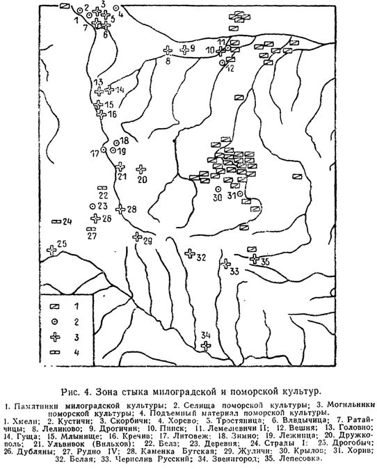 Рис. 4. Зона стыка милоградской и поморской культур Определение поздней даты МЛГРК обычно связывается с решением вопроса о преемственности с ней зарубинецкой культуры [например, 311, с. 12]. Большинство исследователей считает, что две культуры не связаны генетически [255; 283, с. 19 и др.] и что жилище, погибшее в пожаре, обнаруженное на городище Милоград (прил., № 217), содержащее материалы МЛГРК и зарубинецкой культуры, не расчлененные стратиграфически, нельзя считать достоверным комплексом [133, с. 16 - 17]. Поскольку материалы именно этого жилища послужили в свое время для обоснования сосуществования двух культур [256, с. 10, 158- 159], утверждение о недостоверности этого комплекса требует дополнительной аргументации. Обнаруженные в жилище позднелатенские фибулы с пластинчатыми приемниками [256, рис. 31, 15, 16] датируются временем около рубежа эр [162, рис. 5] и синхронны сожжению среднеднепровских городищ зарубинецкой культуры сарматами [219, с. 16 -17]. Литые треугольные бляхи со спиралевидными украшениями (рис. 3, 36) датируются V в. до н. э. (см. выше). Таким образом, разрыв датировок материалов МЛГРК и зарубинецкой культуры в жилище достигает по меньшей мере четырех столетий, и сочетание в нем милоградской и зарубинецкой керамики может быть объяснено тем, что зарубинецкая землянка была впущена в культурный слой милоградского времени. Последовавший после пожара обвал стенок жилища и привел к смешению в его заполнении материалов двух культур. Единственным аргументом для обоснования преемственности или сосуществования двух культур остаются типологические соображения, зачастую неубедительные [например, 311, с. 12]. Впрочем, даже если предположить, что часть населения МЛГРК в виде некоей автаркии и существовала вплоть до II в. до н. э., это вряд ли изменит наши представления о сложении зарубинецкой культуры: МЛГРК могла сыграть в этом процессе лишь пассивную, крайне ограниченную роль территории, подвергшейся быстрому освоению и ассимиляции пришлым населением. Наши хронологические изыскания позволяют внести ряд уточнений и в вопрос отождествления носителей МЛГРК с неврами Геродота [256, с. 168- 176]. Локализация невров в верховьях Тираса - Днестра и соседство их с агафирсами (Герод., IV, 51, 52, 100), занимавшими территорию современной Трансильвании [173], не противоречит отождествлению с неврами волынского варианта МЛГРК. То, что невры живут вместе с будинами (Герод., IV, 105), локализуемыми исследователями в лесостепной части Днепро-Донского междуречья [99, прим. 613], позволяет соотнести с неврами и подгорцевский вариант. Оба варианта складываются в VI в. до н. э., что прекрасно сообразуется с сообщениями Геродота: "За одно поколение до похода Дария они совсем покинули свою страну из-за змей. Дело в том, что много змей появилось у них в стране, а другие, более многочисленные, устремились к ним сверху из пустынь, пока, наконец, невры, теснимые ими, не поселились вместе с будинами, покинув свою землю" (Герод., IV, 105). В будинах, следовательно, можно видеть население киевской группы скифской культуры, "вместе" с которыми жили невры - носители подгорцевского варианта МЛГРК. В появлении "змей" можно видеть процесс увеличения увлажненности Полесья, заставивший невров искать новых мест обитания. В то же время нашествие "змей" "сверху, из пустынь", может отражать начавшийся процесс консолидации населен