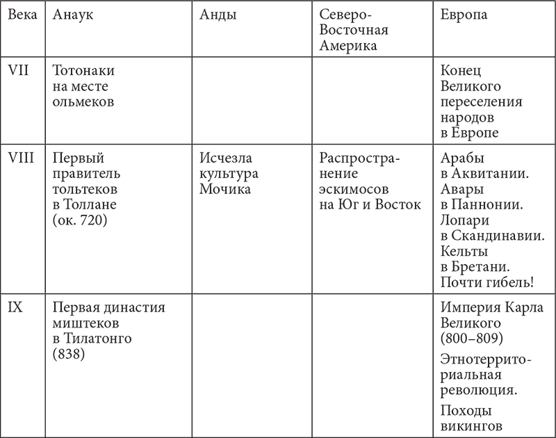 Если мы рассмотрим историю Европы и Америки в предложенном диахроническом аспекте, то увидим, что и в Америке было свое «Великое переселение» и «гибель античной культуры», но пассионарный толчок, вызвавший новый взрыв этногенеза, произошел на 500 лет позже – в XIII в. Ацтеки и инки, создавая свои империи, были для местного населения такими же захватчиками, какими для кельтов были англосаксы, а для галло-римлян – франки. Следовательно, в начале XVI в. ацтеки и инки переживали тот же возраст, что французы, испанцы и итальянцы в Х в. А ведь это эпоха дезинтеграции европейской культуры, унаследованной от Рима, и снижения сопротивляемости внешним ударам! Венгры, берберы, скандинавы грабили Каролингскую империю и англосаксонские королевства столь же успешно, как в XVI в. испанцы и португальцы – свои будущие колонии. По-видимому, ацтеки и инки были застигнуты вторжением в переломный момент роста, при переходе динамической фазы подъема в акмеатическую фазу расцвета, который не наступил из-за помехи извне (см. табл. 4 на с. 450–451).