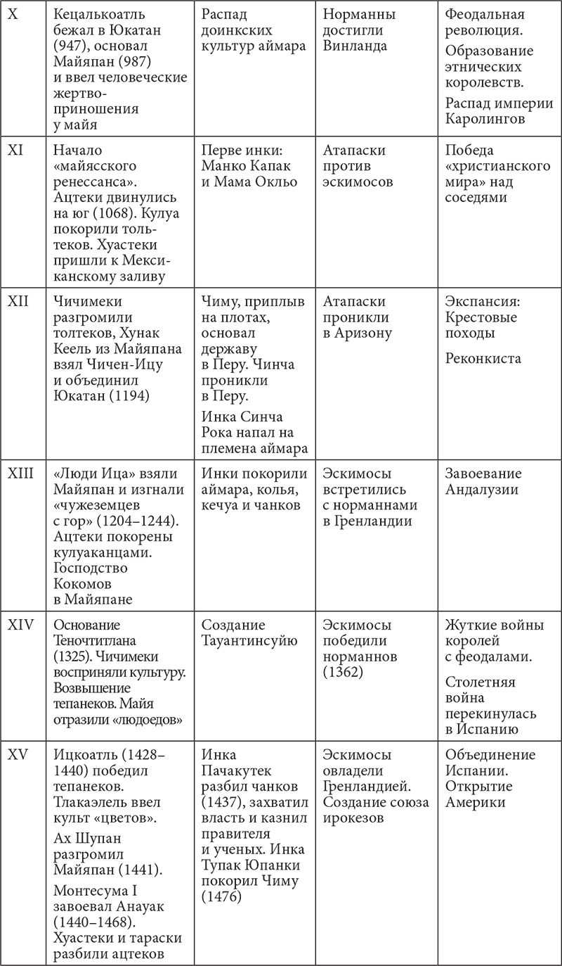 Только в XI в. на юге Перу появились, если верить легенде, первые инки: Манко Капак и Мама Окльо, и тогда же, около 1068 г., предки ацтеков перешли Рио-Гранде и двинулись в числе других племен на юг. В XII в. чичимеки (букв. «дикари») покорили остатки тольтеков, культурная традиция коих оборвалась, как римская – в Галлии и Испании. Лишь в XIV в. ацтеки основали Теночтитлан (1325) и восприняли остатки культуры тольтеков. В том же XIV в. Инка Виракоча создал ту империю, которую завоевали испанцы, но историчность Виракочи – под сомнением. Только в 1437 г. Инка Пачакутек победил чанков, достойных противников инков, казнил их правителя и вынудил остатки этого этноса бежать в сельву Амазонии на верную смерть[61]. Затем он захватил престол, казнил ученых, знавших историю инков, запретил изучение письменности и ввел полицию нравов, чем утвердил цивилизацию инков. Он был современником Жанны д’Арк, Яна Гуса, Петрарки и Джотто. А по месту в этногенезе, или по возрасту этноса, Виракоча эквивалентен Карлу Великому, а Пачакутек – Людовику Благочестивому и Лотарю, даровавшим одичавшей Европе возможность Каролингского возрождения, образованности и творческой мысли.