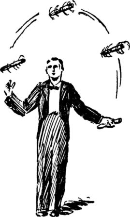 Не успеют стихнуть аплодисменты, как артист приступает к «номеру», еще более изумительному по своему эффекту. Жонглер начинает вдруг бросать к зрителям одну за другой несколько шляп. Шляпы, пролетая вереницей над головами зрителей, постепенно «набирают высоту». Затем, к изумлению публики, описав небольшую дугу, они возвращаются в руки артиста.