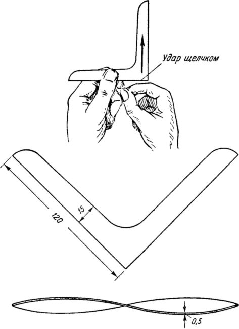 Нетрудно сделать маленькую модель бумеранга из кусочка тонкого картона. Такой бумеранг надо «запускать» щелчком по его уголку, как показано на рис. 4.