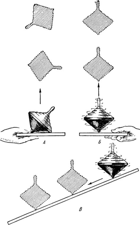 Рис. 6. Различные случаи «поведения волчка». А — невращающийся волчок, подброшенный, взлетает, беспорядочно кувыркаясь в пространстве; Б — быстро вращающийся волчок, подброшенный, устойчиво сохраняет свое положение в пространстве; В — на наклонной плоскости быстро вращающийся волчок легко «сбегает» под уклон, устойчиво сохраняя вертикальное положение своей оси в пространстве.